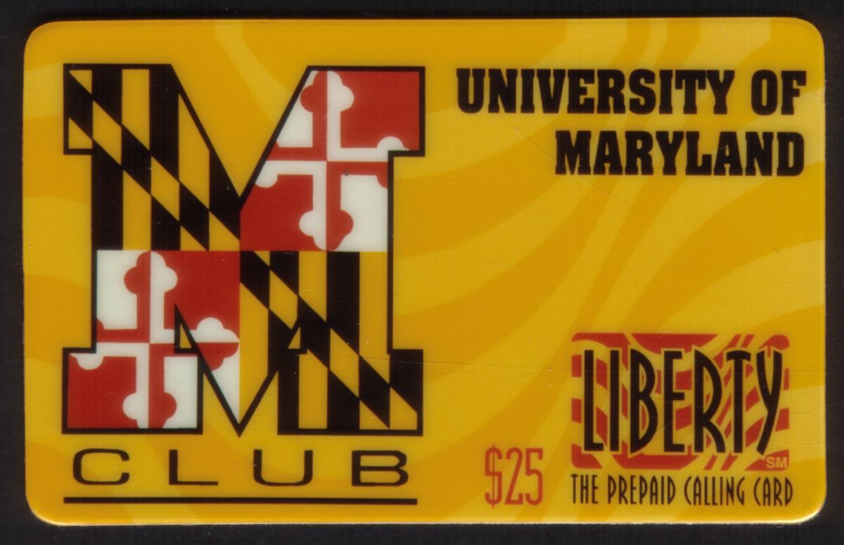 Below the main emblem, the word "CLUB" is printed in a clean, black font. On the lower right corner, the card value "$25" is indicated in red. Adjacent to the denomination, the Liberty logo is shown with vertical red and white stripes and the text "LIBERTY" in large, stylized letters, followed by "THE PREPAID CALLING CARD" in smaller font. This card is a prepaid calling card produced by Liberty for use, bearing clear university and promotional branding connected to the University of Maryland.