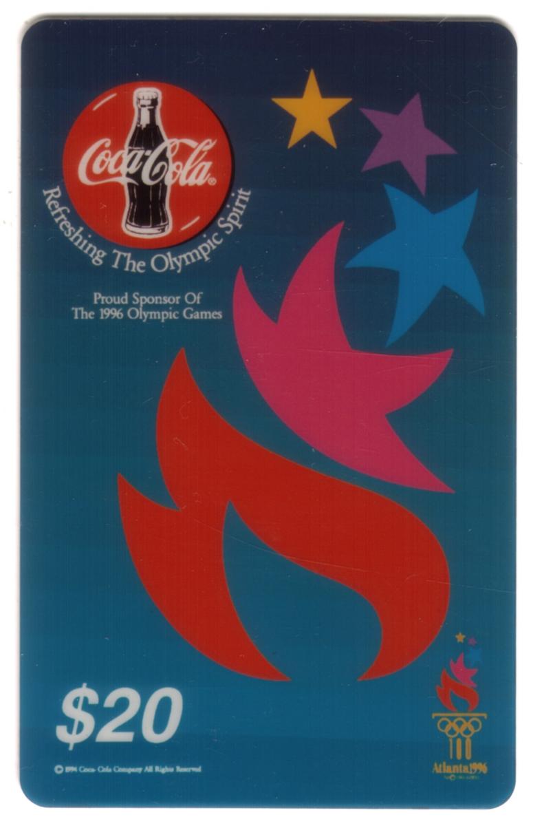 This phone card was issued as a specimen in 1994 by Quest Group International and includes the classic imagery associated with Coca-Cola’s Olympic advertising campaign, such as Coke logos and coke bottles referenced in the design keywords. It serves both as a collectible item and a promotional piece linking Coca-Cola’s brand with the spirit of the 1996 Atlanta Olympics.