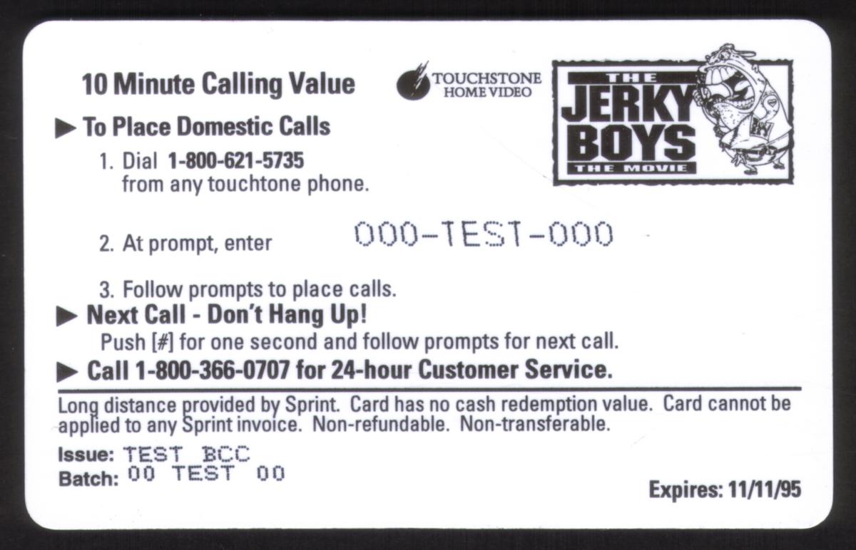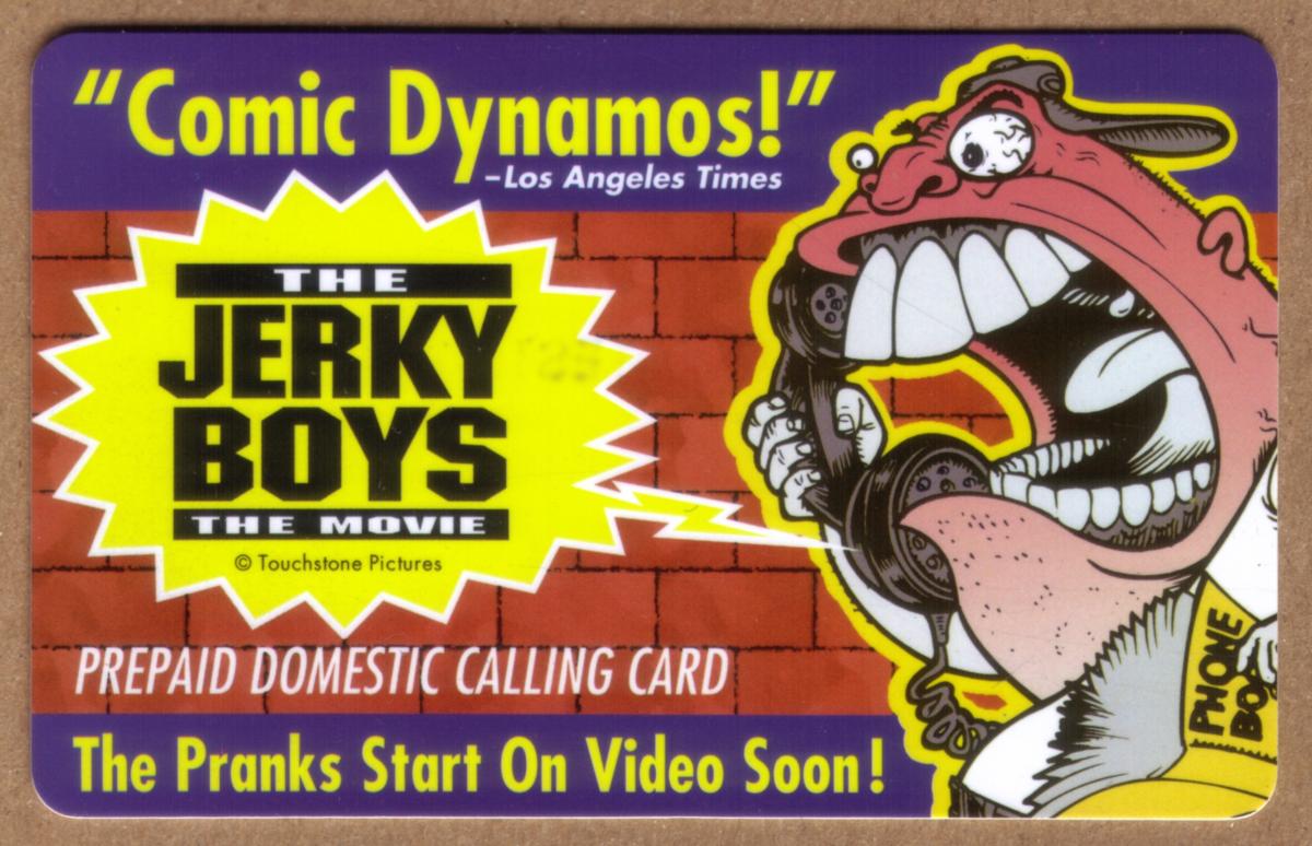 This collectible prepaid domestic calling card features promotional artwork for "The Jerky Boys The Movie," a production by Touchstone Pictures. The card presents a vibrant design with a solid purple border framing a brick wall background. Prominently displayed on the left side is the movie’s logo in bold yellow and black, set inside a bright yellow starburst shape.
