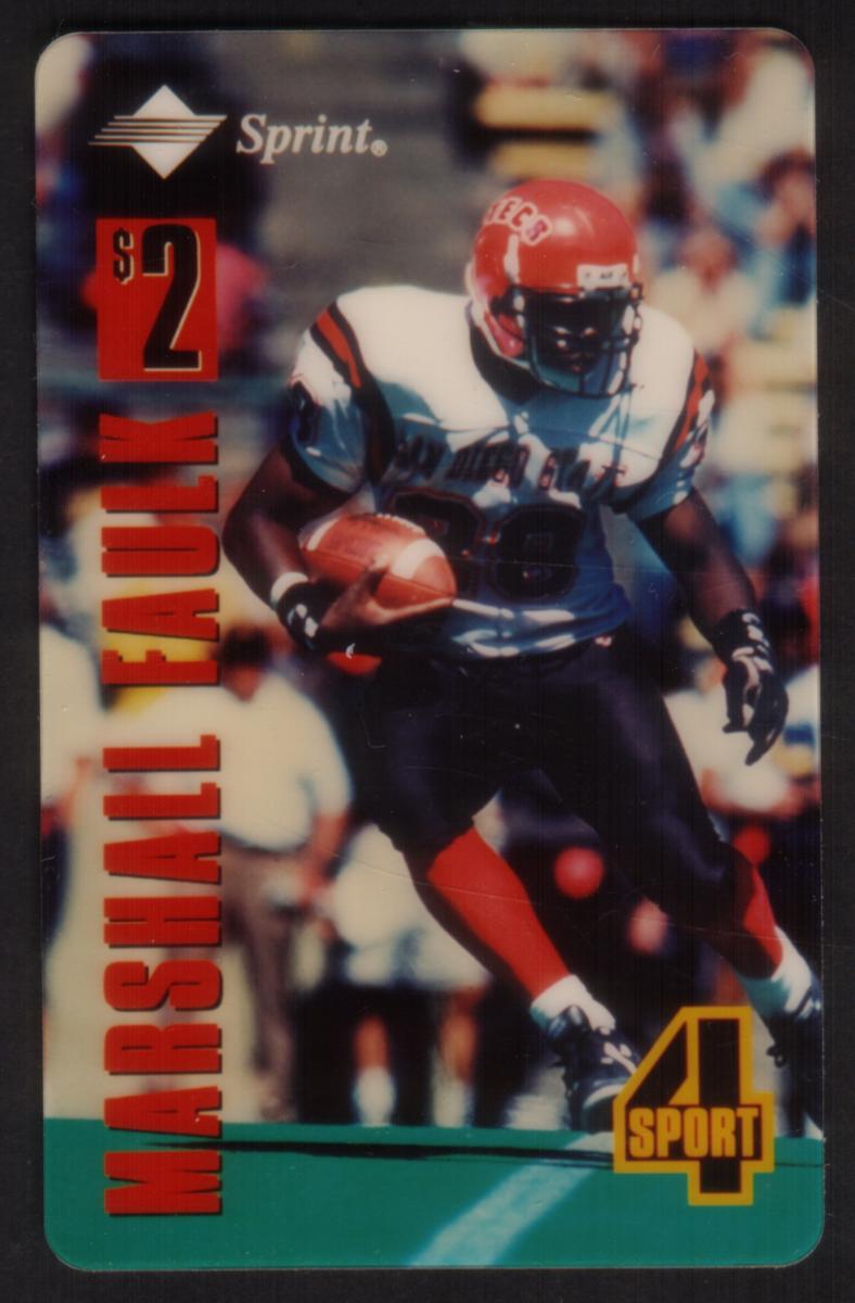The card displays a clear image of Faulk mid-play, with his focus and athletic stance captured sharply against a blurred stadium background filled with fans. The top left corner features the Sprint logo, indicating the card's affiliation with the Sprint telecommunications company. Along the left side, the text "$2 MARSHALL FAULK" is written vertically in bold red letters on a black background, signifying the card’s value and highlighting the featured player’s name.