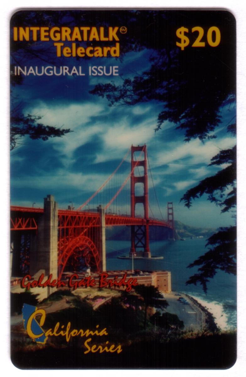 The card is part of the "California Series" by Advantage Communications Group (ACG). The text on the card includes "INTEGRATALK Telecard," "$20," and "INTEGRATALK Inaugural Issue." The words "Golden Gate Bridge" appear in red script near the bottom center, while "California Series" is scripted in yellow at the bottom left. The card highlights its denomination of $20 in the upper right corner.