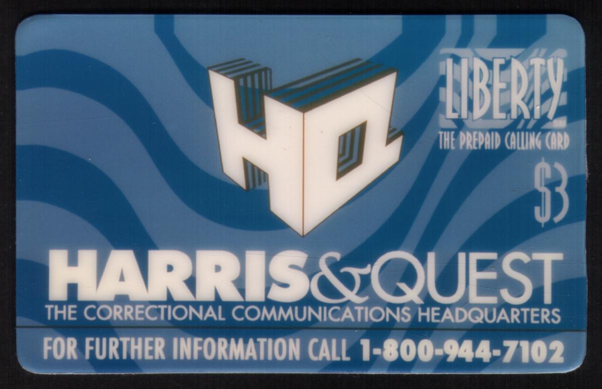 This collectible prepaid calling card features the Liberty brand and is valued at $3. The card is issued by Harris & Quest, identified as "The Correctional Communications Headquarters." The front design includes a stylized "HQ" logo with a 3D effect set against a blue background with wave-like patterns. The text on the card provides a customer service phone number for further information: 1-800-944-7102.