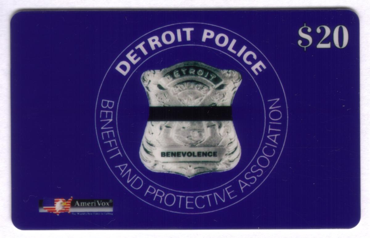This collectible card features a design dedicated to the Detroit Police Benefit and Protective Association. The card prominently displays the emblem of the Detroit Police Department, highlighting its connection to law enforcement and police services. The text on the card includes "Detroit Police Benefit And Protective Association," emphasizing its purpose tied to benevolence and support for the police community. The denomination is $20, indicating its value.