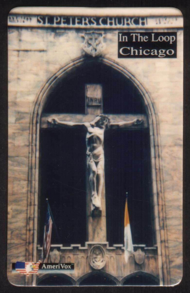 Chicago religious landmark phone card featuring St. Peter''s Church, Gothic crucifix, flags, and historic architecture; reflects faith and local history. |