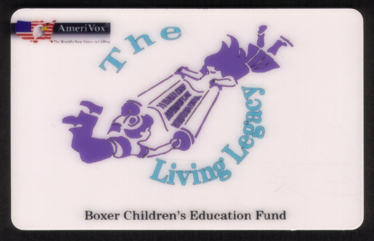The overall design emphasizes the Boxer Children’s Education Fund and is part of the promotional "The Living Legacy" series by AmeriVox. The card’s layout and text focus on supporting this charitable cause.