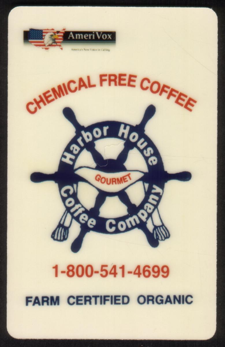 The AmeriVox logo is located near the top left corner of the card and includes a stylized American flag and a small American eagle. The card overall emphasizes the organic and chemical-free nature of Harbor House Gourmet Coffee through clear text and symbolic imagery related to nautical themes and quality coffee.