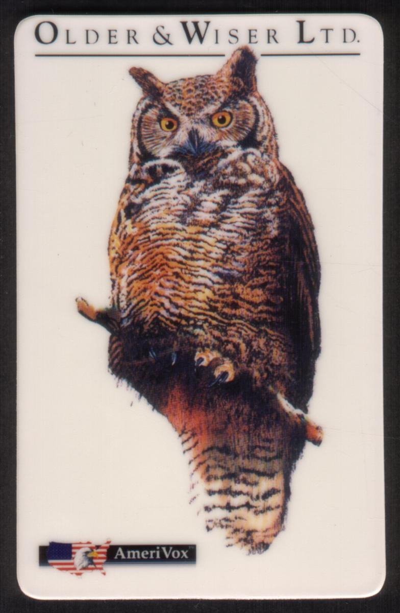 At the top center of the card, the text "OLDER & WISER LTD." is printed in uppercase letters, indicating the issuing company. Near the bottom left corner, the AmeriVox logo appears, consisting of an American flag graphic and the word "AmeriVox" in white text on a black rectangular background. The design includes the words "Photo of Owl. Sept93 'Proof'" just below the company name in the keywords.
