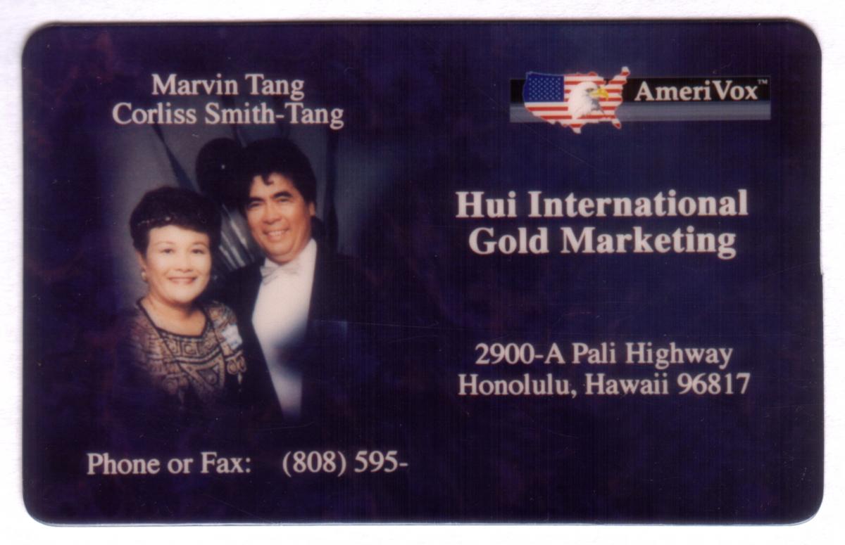 This promotional AmeriVox card features Marvin Tang and Corliss Smith-Tang, representing Hui International Gold Marketing. The card prominently displays their names along the left side above their photographic portrait, which shows both individuals dressed formally against a dark background. The upper right corner includes the AmeriVox logo, featuring an outline of the United States filled with an American flag motif.