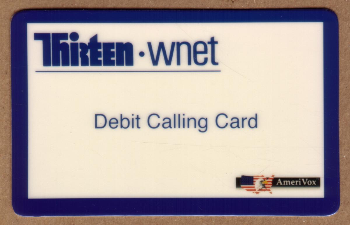 The card is a debit calling card, designed for use in telephone communications with pre-paid value, issued by AmeriVox. The overall presentation aligns with Thirteen - WNET’s identity as a respected media organization focused on educational content and public affairs.
