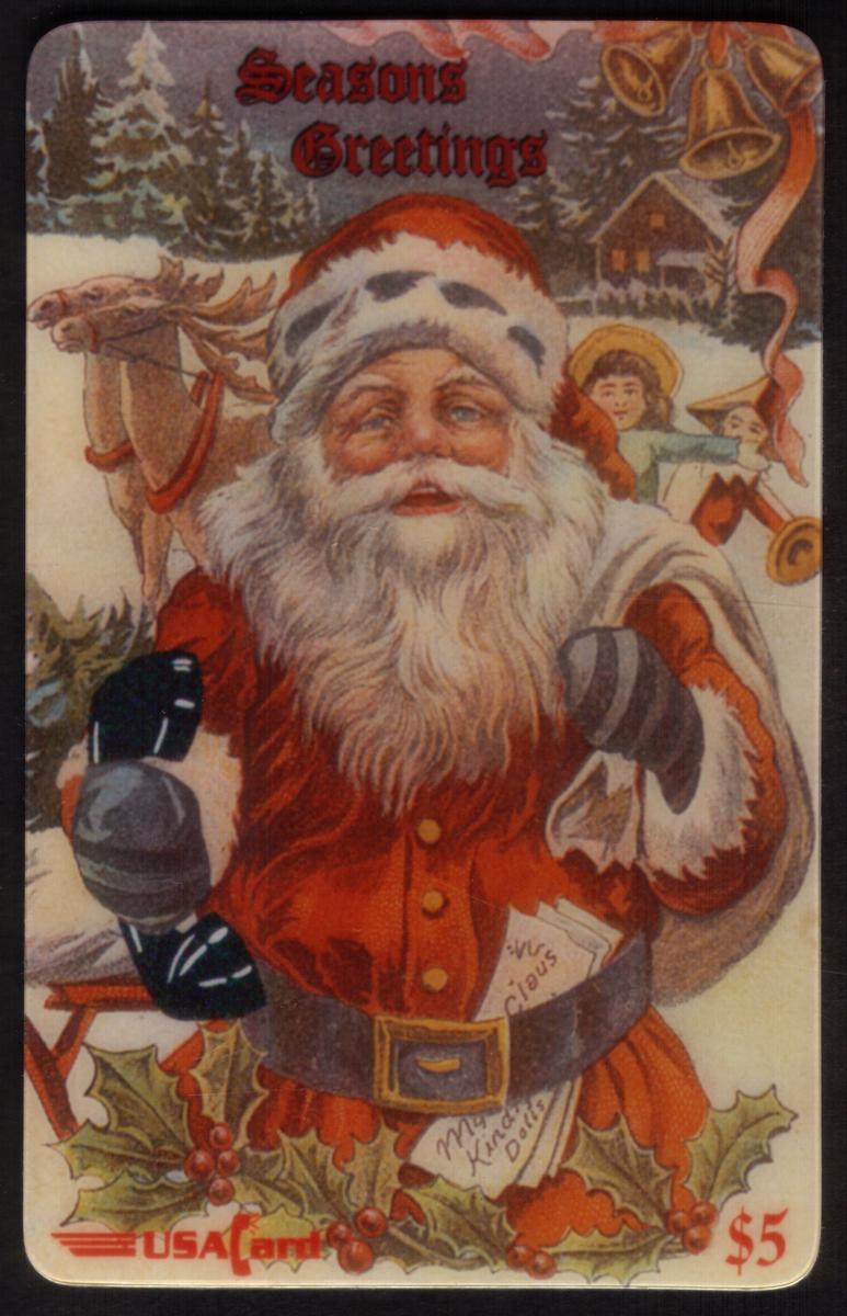 These phone cards were issued by USACard Corporation in 1994, as part of a holiday set. The design evokes traditional Christmas imagery featuring Santa Claus with festive holly, bells, children, and a reindeer, capturing the spirit of the holiday season.