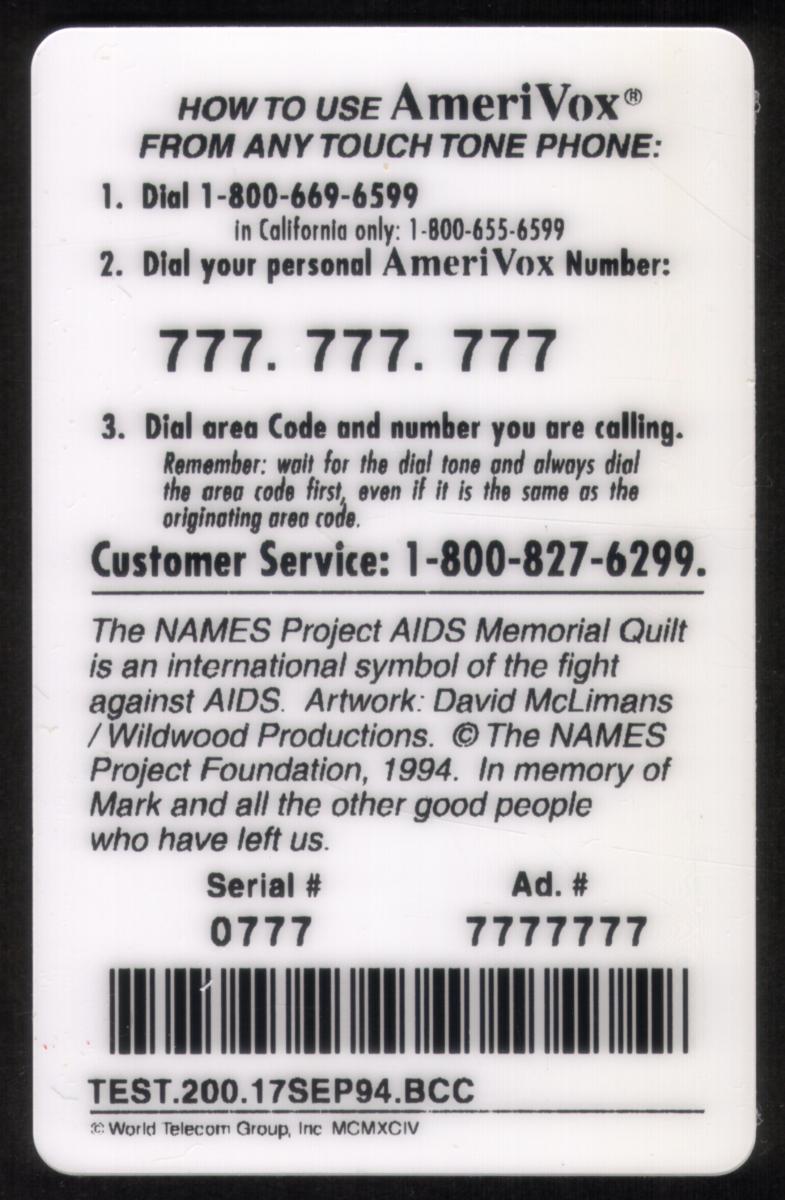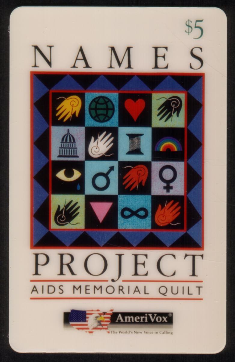 This phone card was created as part of a fundraiser to support charities and memorial efforts related to the AIDS virus and disease. The symbols on the quilt represent inclusivity, remembrance, and solidarity within the AIDS community. The card holds both collectible and commemorative value.