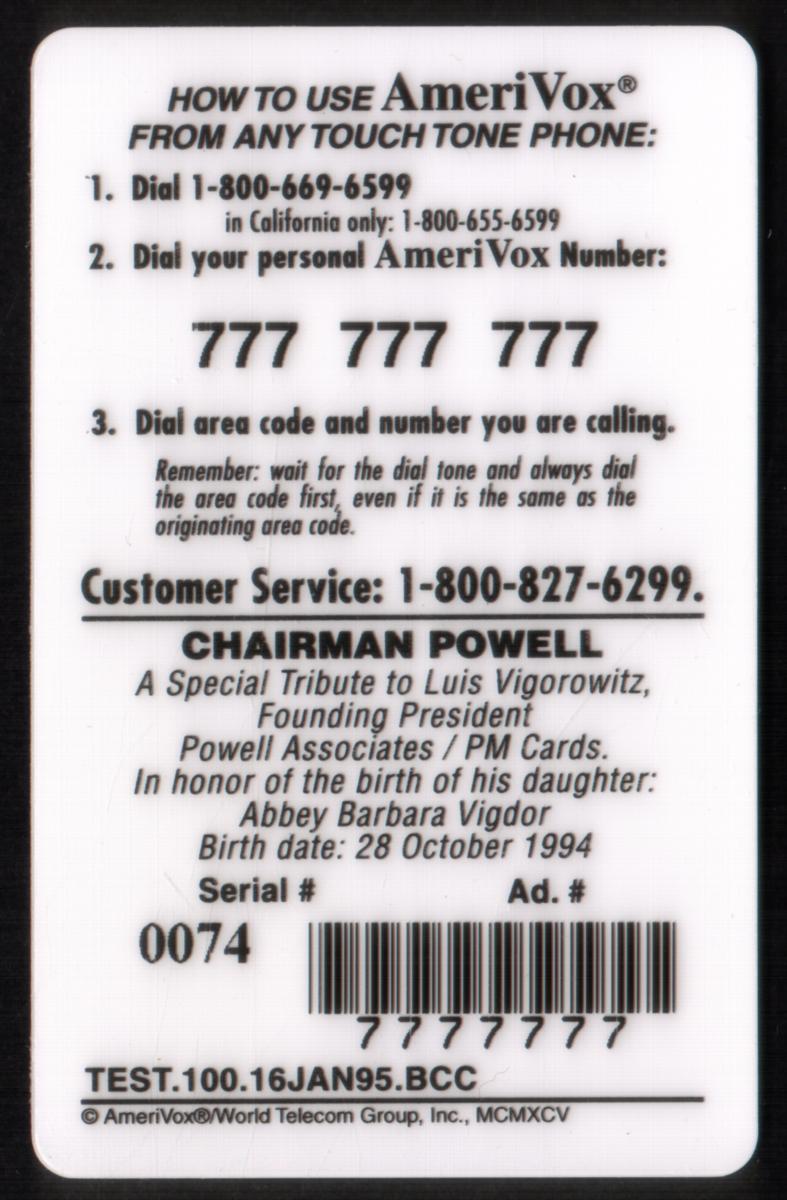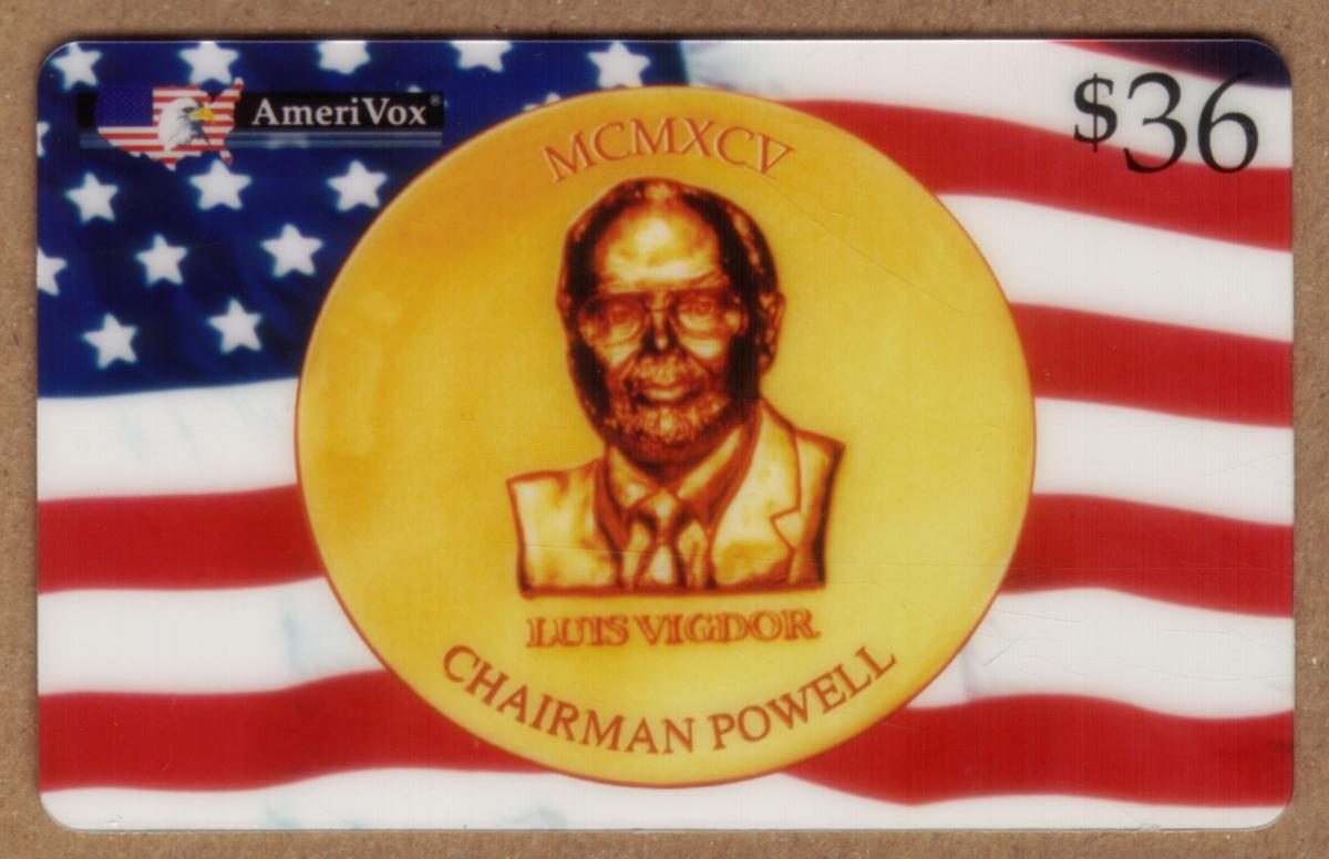 In the top-left corner, the AmeriVox logo appears alongside a small image of the United States flag. The card’s value, "$36," is prominently displayed in the top-right corner. The card connects visually and thematically to Powell & Associates and Luis Vigdor, referencing the phone card dealer and promotional entities.