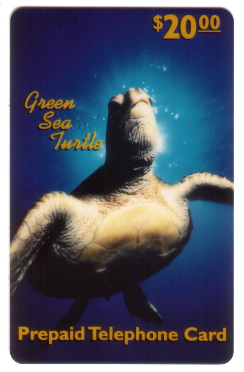 The text “Green Sea Turtle” appears in yellow script font on the upper left side of the card. The card value, printed as "$20.00," is located in the top right corner in bold yellow font. At the bottom center of the card, the words “Prepaid Telephone Card” are prominently displayed in yellow block letters.