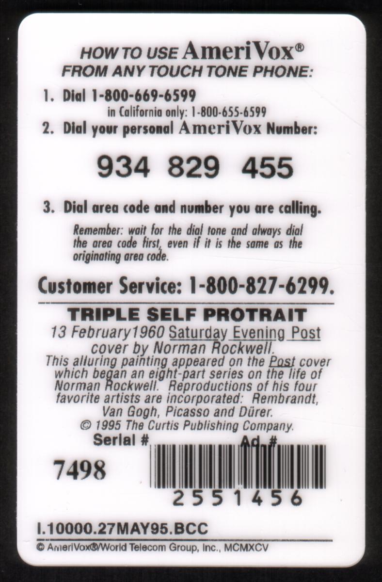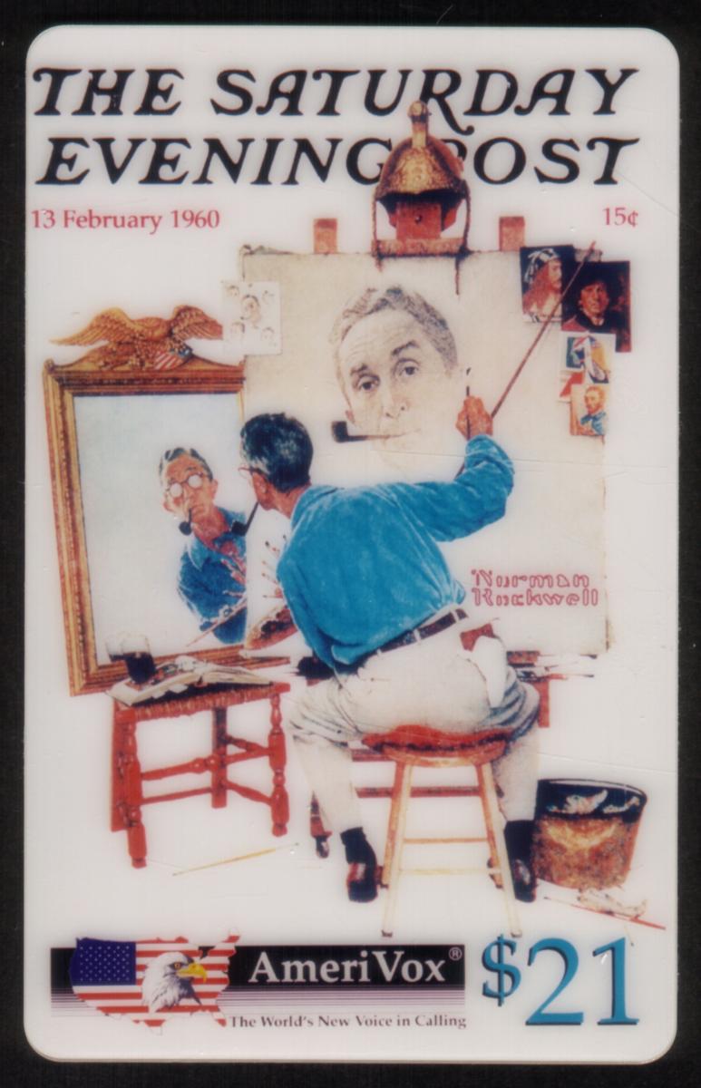 This collectible phone card features the iconic February 13, 1960 cover of The Saturday Evening Post magazine, illustrated by Norman Rockwell. The artwork, titled "Triple Self-Portrait," shows Norman Rockwell seated on a wooden stool, painting a self-portrait on an easel. Rockwell is depicted wearing a blue shirt and white pants, holding a brush in his right hand as he looks at himself through a mirror positioned on the left side of the composition. The mirror reflects Rockwell's face and upper body, aiding him in capturing his likeness on the large canvas in front of him.