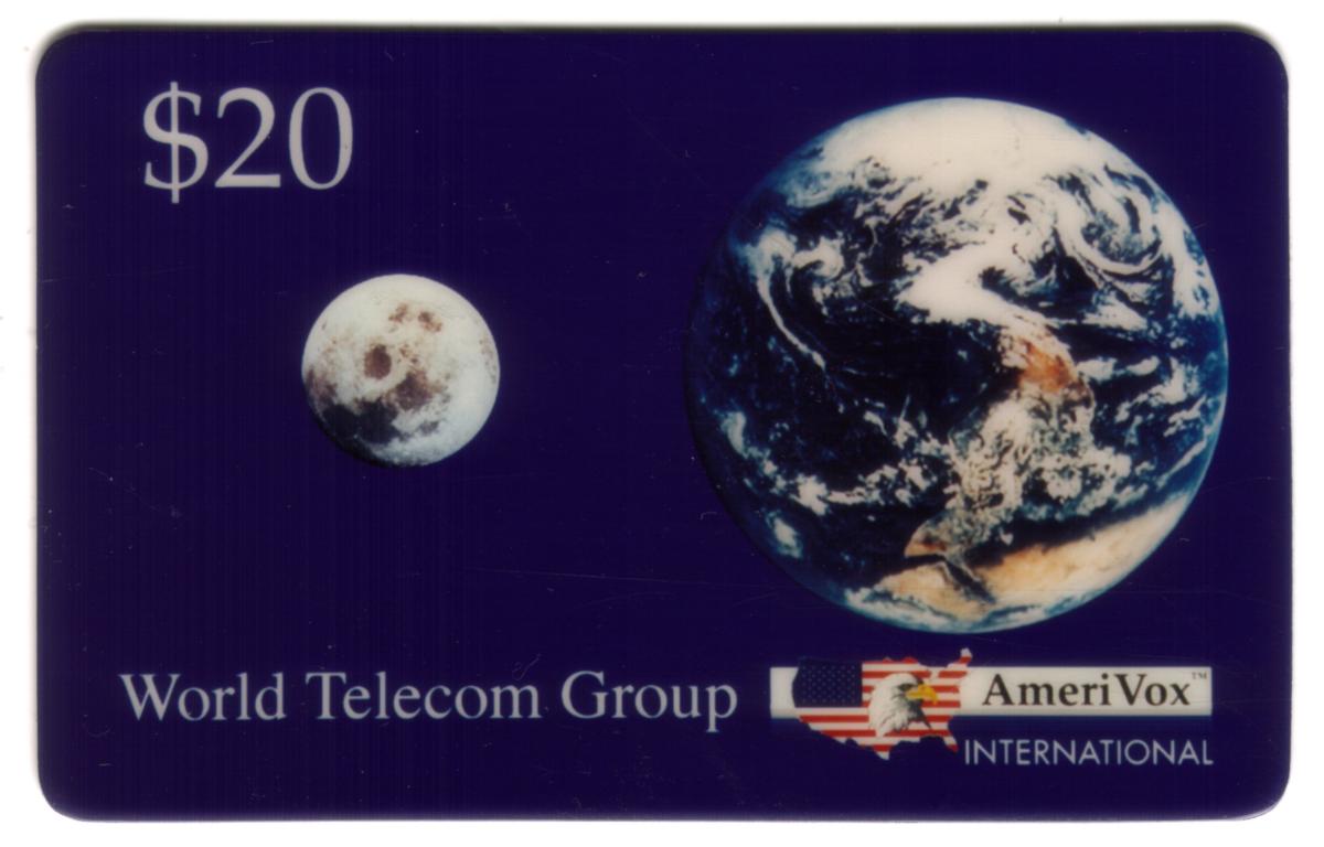 This card highlights themes of space exploration and satellite imagery with a focus on Earth and its natural satellite, the Moon, emphasizing the connection to global telecommunications operated by World Telecom Group and AmeriVox.