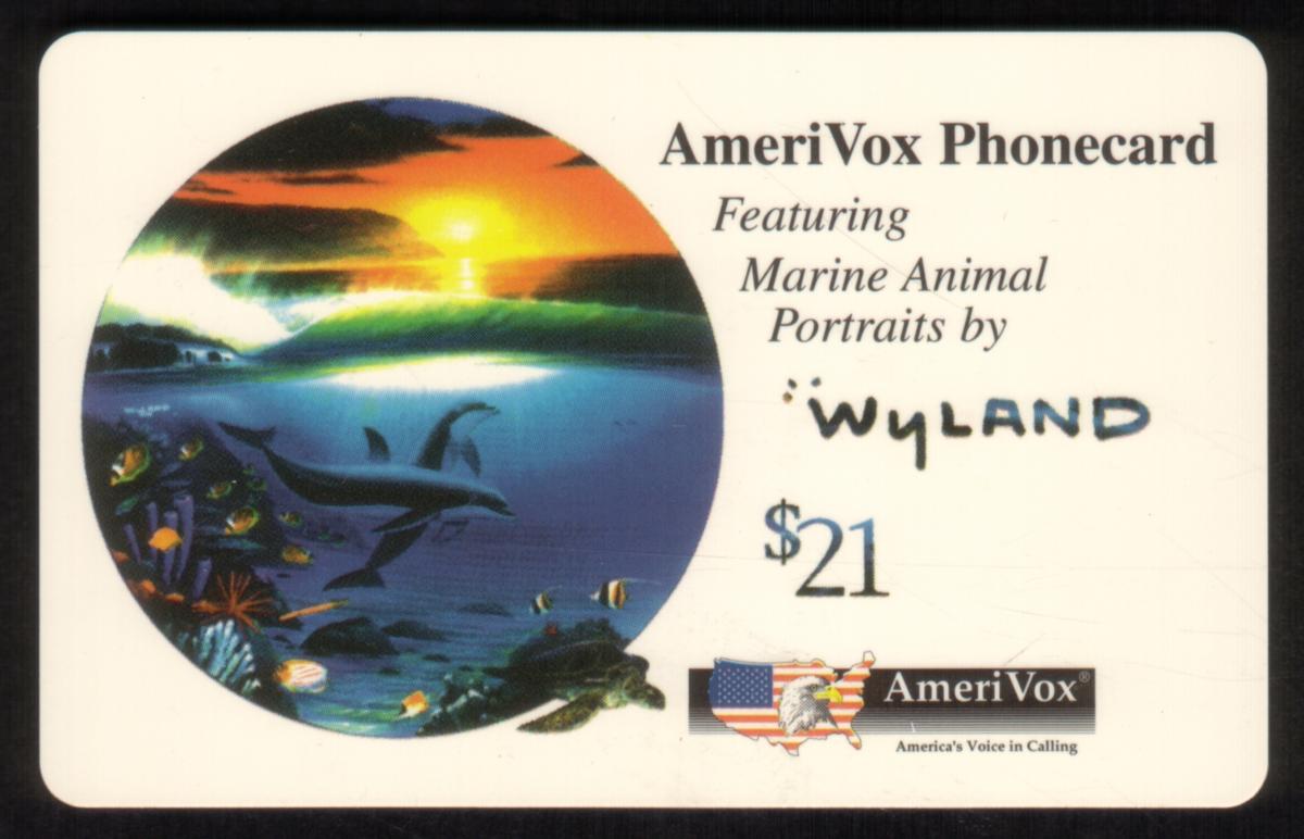 The card has a white background with text positioned to the right of the circular image. It states “AmeriVox Phonecard Featuring Marine Animal Portraits by Wyland” along with a denomination of $21. Below the text is the AmeriVox logo, consisting of a small American flag graphic merged with an eagle and America’s outline, accompanied by the slogan “America’s Voice in Calling.”