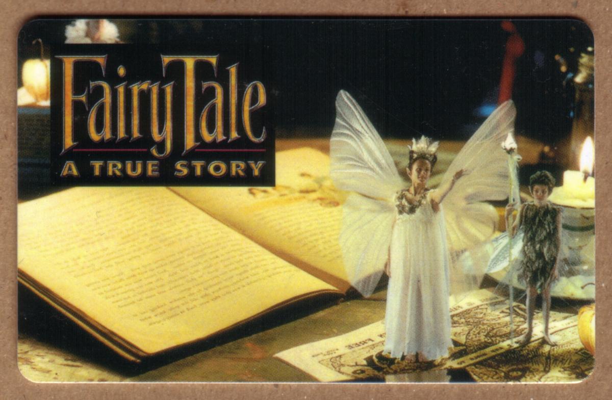 The card is clearly marked as promotional material connected to the film "Fairy Tale: A True Story," and it relates directly to the fantasy drama genre. The detailed presentation of the fairies and the open book visually reflect the storytelling aspect of the movie.