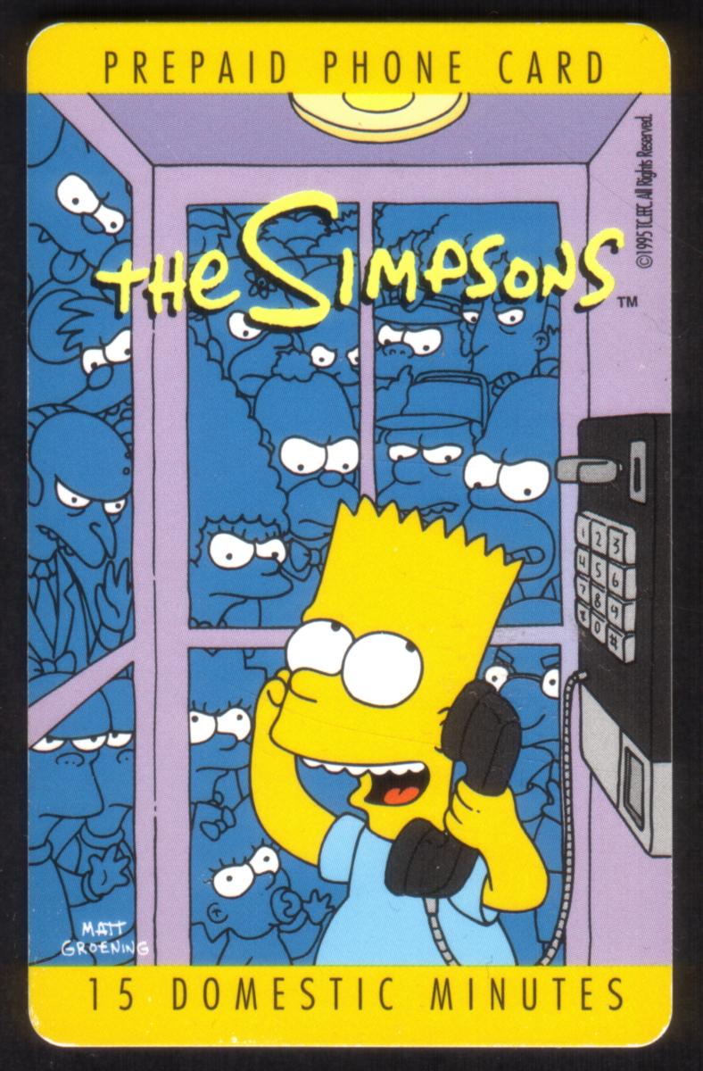 The card has a yellow border at the top and bottom. The top yellow border shows the text “PREPAID PHONE CARD” in black capital letters. At the center of the card, above Bart's head, the iconic yellow logo of "The SIMPSONS" is displayed prominently in a stylized font consistent with the animated series. The bottom yellow border indicates "15 DOMESTIC MINUTES" in black capital letters.