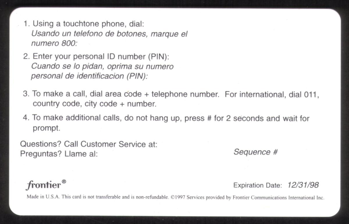 Since we have the world's largest inventory of USA phonecards for collectors, you will not necessarily receive the identical serial/batch/PIN number that we have scanned/pictured.