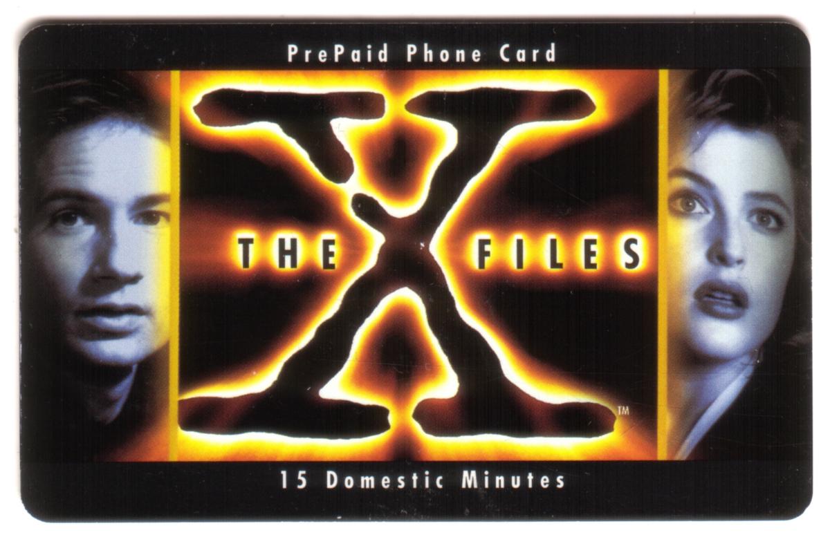 The top center of the card includes the text "PrePaid Phone Card," indicating its function as a prepaid calling card, while the bottom center reads "15 Domestic Minutes," specifying the card's credit limit for calls within the United States. The overall design has a dark, mysterious aesthetic that aligns with the show's science fiction and investigative themes.