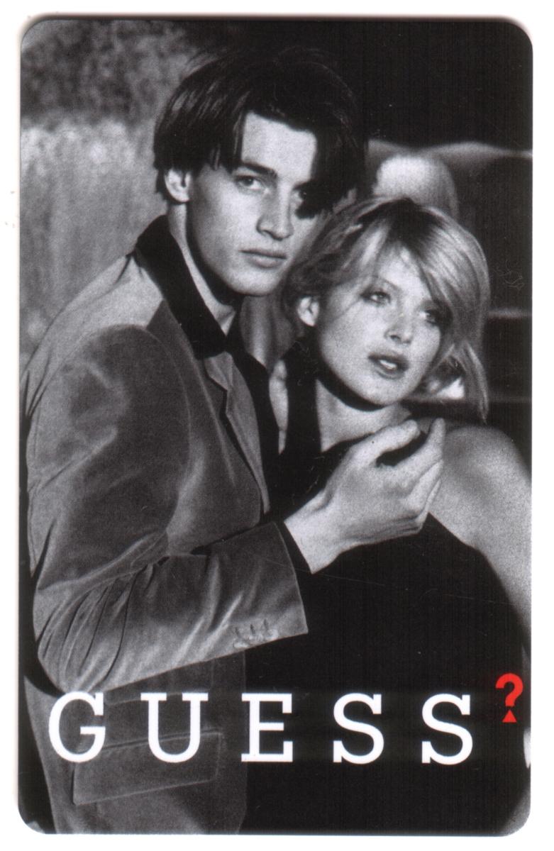 This collectible phone card features a black-and-white photographic image of a young man and woman closely embracing. The man, with dark hair styled over his forehead, is wearing a suit jacket over a collared shirt. The woman has blonde hair and is dressed in a sleeveless black top, looking slightly to the side. The word "GUESS?" is printed in large white capital letters at the bottom of the card, with the question mark in red.