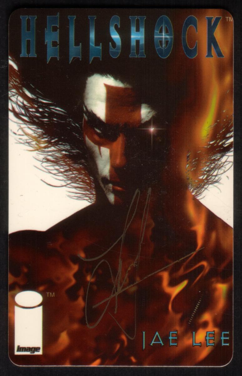 At the bottom left corner, the Image Comics logo is present, indicating this card is officially tied to the publisher. The lower right area features the autograph of Jae Lee in gold ink, alongside his name printed in distinctive capital letters with a glowing effect, confirming the card’s connection to the artist. This phone card is a limited edition issued by Global Tel. Solutions that celebrates the iconic Hellshock artwork by Jae Lee, making it a valuable collectible for fans of comics and original graphic art.