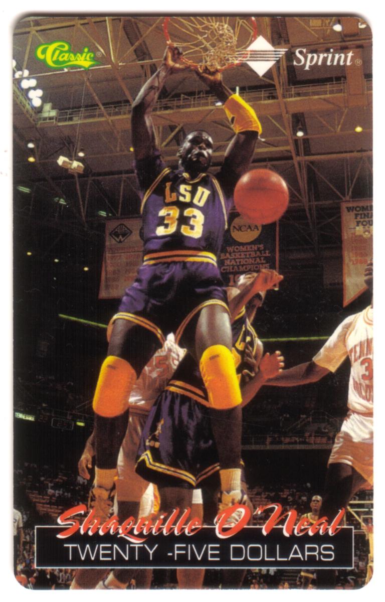 Prominently displayed on the card are the logos "Classic" in green and "Sprint" in white at the top corners. The bottom section shows Shaquille O'Neal’s name in an orange script font, followed by the marked value "TWENTY-FIVE DOLLARS" in white capital letters on a black rectangular background panel. The card reflects a 1990s theme tied to NCAA basketball, spotlighting one of the sport’s most famous players during his LSU tenure.