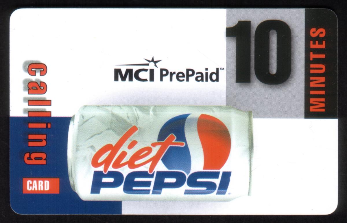 This collectible phone card features a prominently displayed image of a Diet Pepsi can lying on its side. The can design includes the classic Pepsi logo with red, white, and blue colors and the words "diet PEPSI" in red and blue lettering. The card background is predominantly white with a blue section on the lower left side.