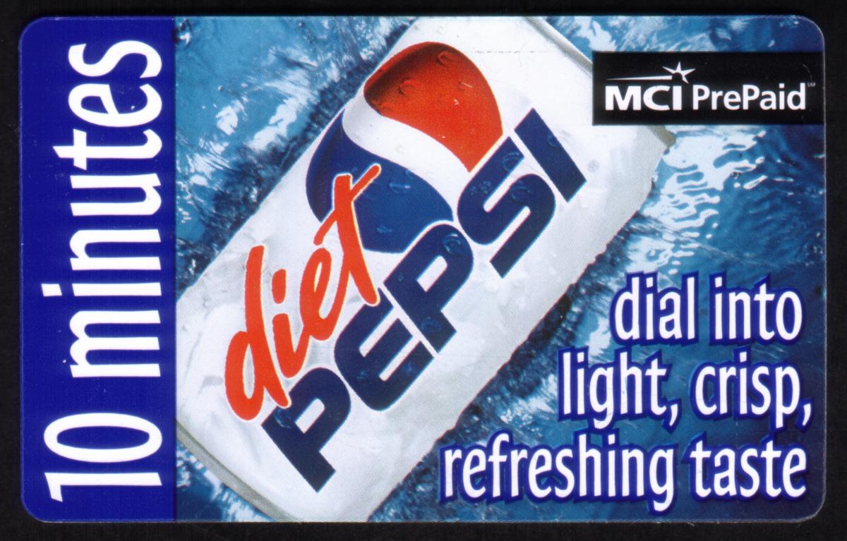 In the upper right corner is the MCI PrePaid logo, identifying the telecommunications provider for this card. The right side of the card also contains the advertising slogan “dial into light, crisp, refreshing taste” in white text layered over the watery background, reinforcing Diet Pepsi’s branding message.