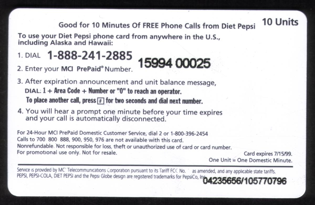 This card is a promotional item linked to Pepsi-Cola and offers 10 minutes of prepaid calling time. It expired on July 15, 1999, and was issued by MCI Telecommunications Corporation. The overall design combines vibrant brand imagery with clear telecommunications information.