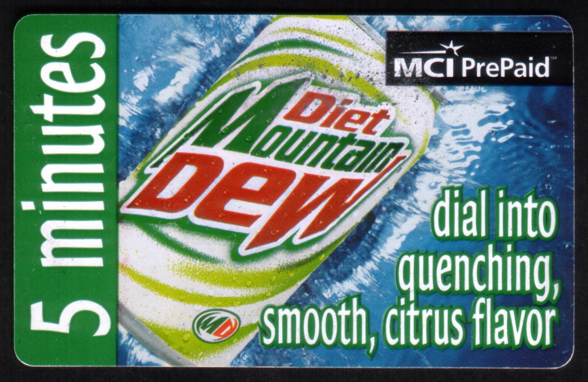 This collectible MCI PrePaid phone card features vibrant branding for Diet Mountain Dew. The center of the card prominently displays an image of a Diet Mountain Dew can set against a swirled blue and white background. The can is tilted diagonally, showing the iconic green and red logo along with Diet Mountain Dew text.