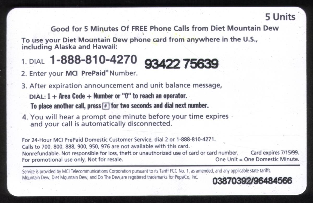 The card combines promotional imagery for PepsiCo's Diet Mountain Dew product with telecommunications branding from MCI. The expiration date shown is July 15, 1999, confirming the card's vintage nature. This card is intended for prepaid telephone use and emphasizes the refreshing, citrus flavor of Diet Mountain Dew as part of its theme.