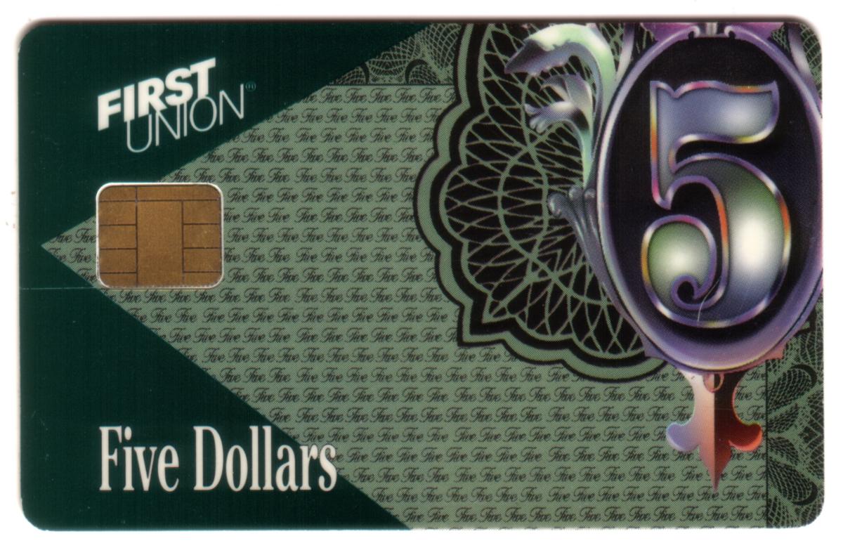 This is a First Union Corp. Bank Card used as a stored value card with a denomination of five dollars. The card design features a dark green background with a repetitive pattern of the words "First Union" printed in a small, light font across the central section. The top left corner contains the white text "FIRST UNION" with "FIRST" left-aligned above "UNION." The text "Five Dollars" is prominently displayed in large white serif font in the lower left portion of the card.