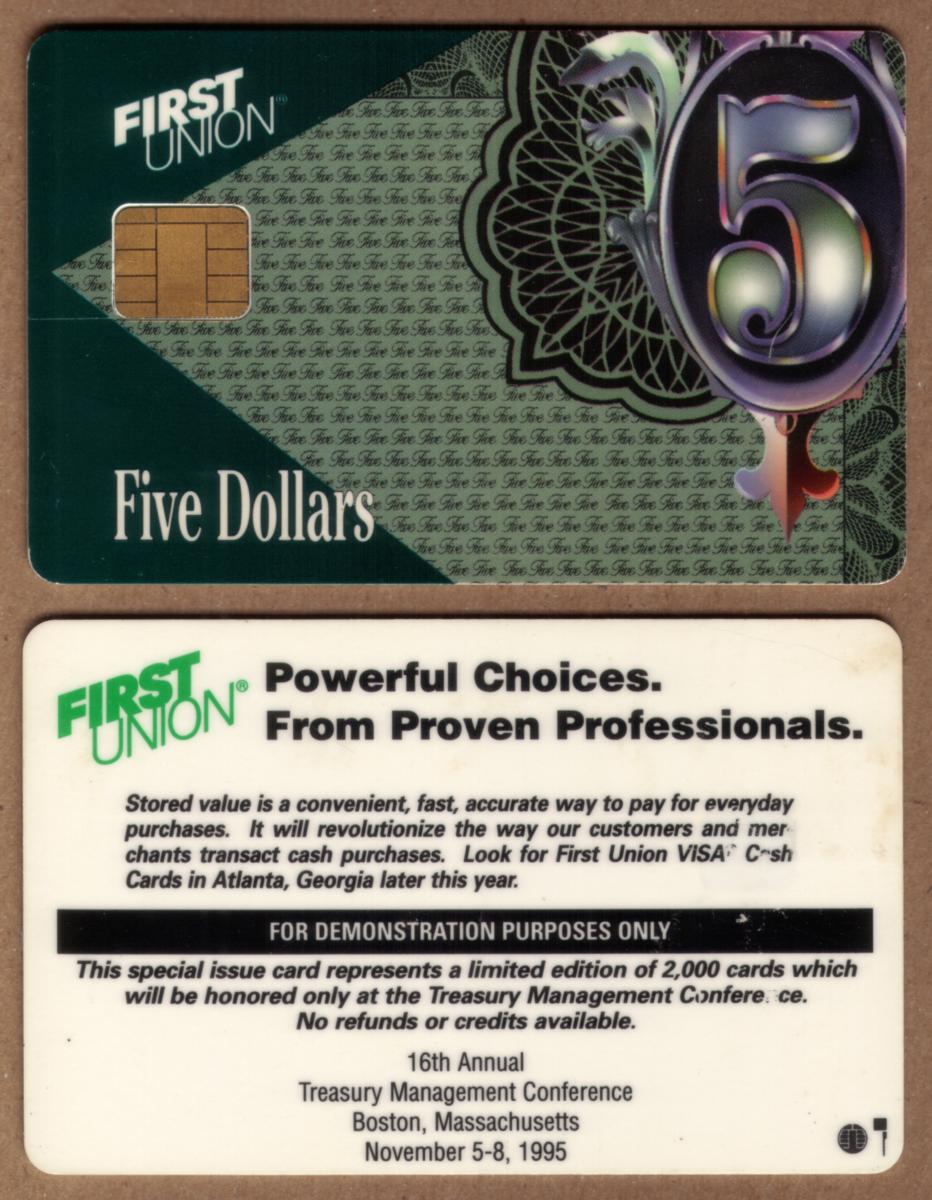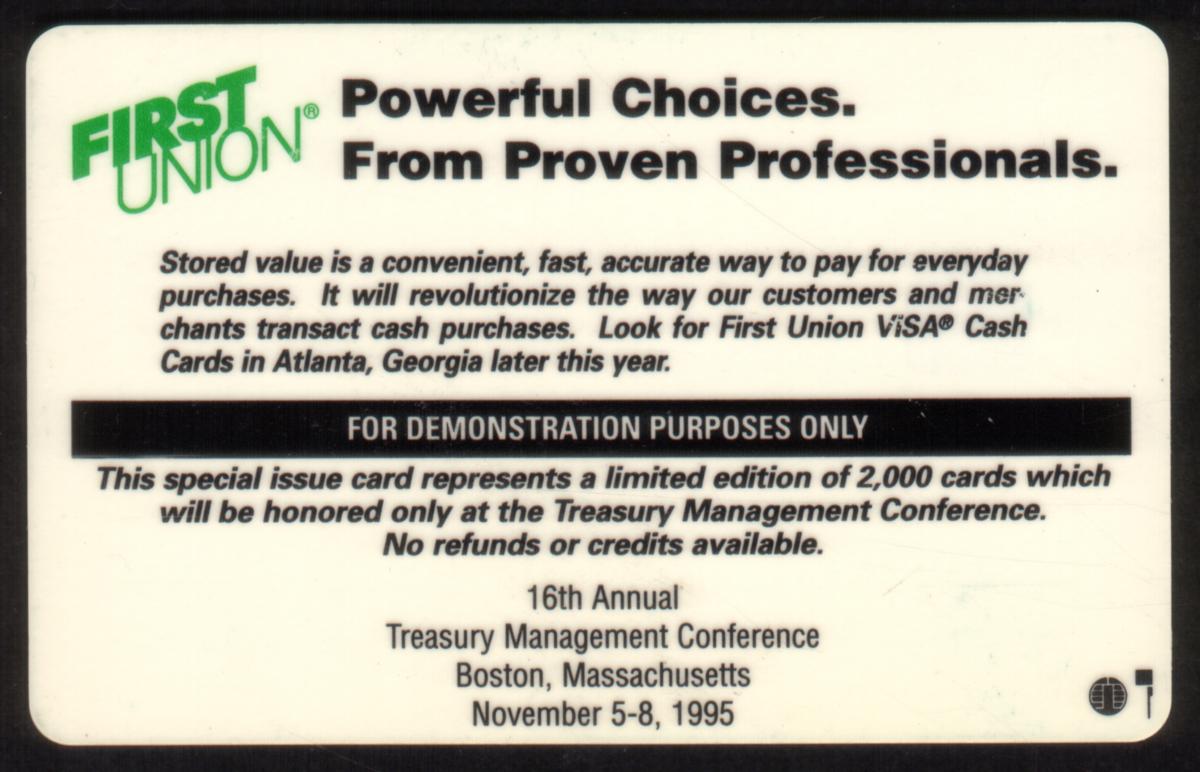 This card was issued for the 16th Annual Treasury Management Conference held in Boston, Massachusetts, in November 1995. It is a demonstration card with stored value functionality, representing powerful choices from proven professionals. The card is specifically for demonstration purposes only and was issued by First Union Corp. Bank.