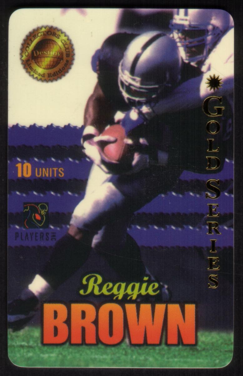 The front of the card also includes the logo and branding for Destiny Telecomm, a company associated with collectible football cards. The NFL (National Football League) connection is evident through references to football players and the sport. The card’s overall design incorporates graphic elements consistent with football memorabilia, celebrating the achievements and status of Reggie Brown within the sport.