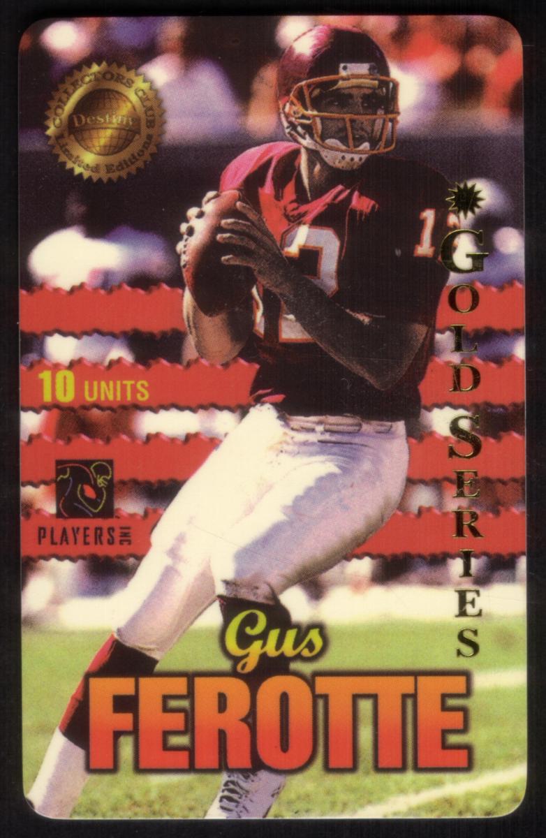 This collectible phone card features Gus Ferotte, a quarterback for the Washington football team, prominently displayed on the card. The card is numbered 99 out of a limited edition of 100, highlighting its exclusivity. The design includes football imagery associated with the National Football League (NFL), with a specific focus on Gus Ferotte in his role as a quarterback.
