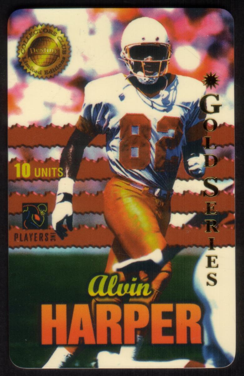 The design incorporates a football theme, with a visible football image in the background. The NFL logo is also present, signaling the card’s official licensing from the National Football League. The card highlights Alvin Harper’s role as a notable football player within this limited collection.