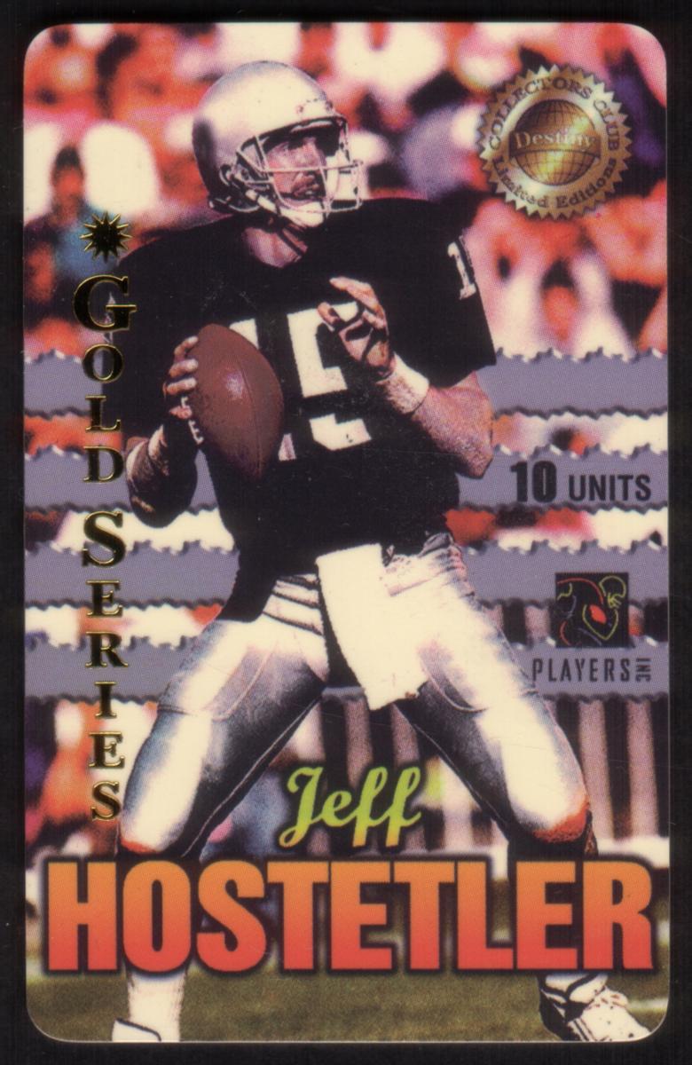 This collectible football card features Jeff Hostetler, quarterback for the Oakland NFL team. The card is titled "10u GOLD Men of Destiny Jeff Hostetler QB Oakland" and is marked as number 70 out of 100 produced. The player is depicted in his football uniform, without a visible helmet number, emphasizing his role and position clearly on the front of the card.
