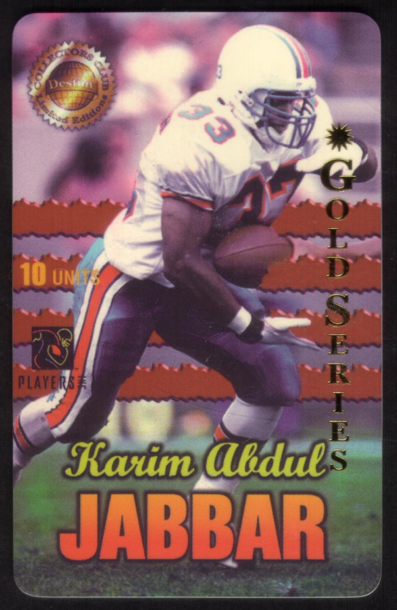 This collectible telecommunication card features an action image of Karim Abdul-Jabbar, a football player, running with the ball. He is wearing a white football helmet and white jersey with the number 33 clearly visible on both his helmet and jersey. His pants are dark with orange and white stripes along the side. The card highlights Karim Abdul-Jabbar’s name prominently at the bottom in yellow and orange text, with "Karim Abdul" in cursive and "JABBAR" in bold block letters.
