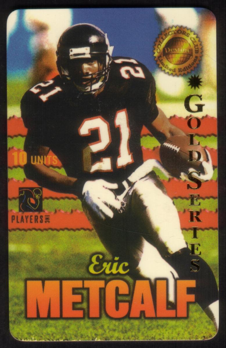 Additionally, the card mentions "Destiny Telecomm," connecting it to the Destiny Telecomm company or series. It recognizes Eric Metcalf’s dual roles as RB-WR (running back and wide receiver) within the National Football League (NFL). The NFL logo is present, confirming the card’s official association with the league. This card is a collectible item related to American football and the NFL, celebrating Eric Metcalf’s career with the Atlanta Falcons.