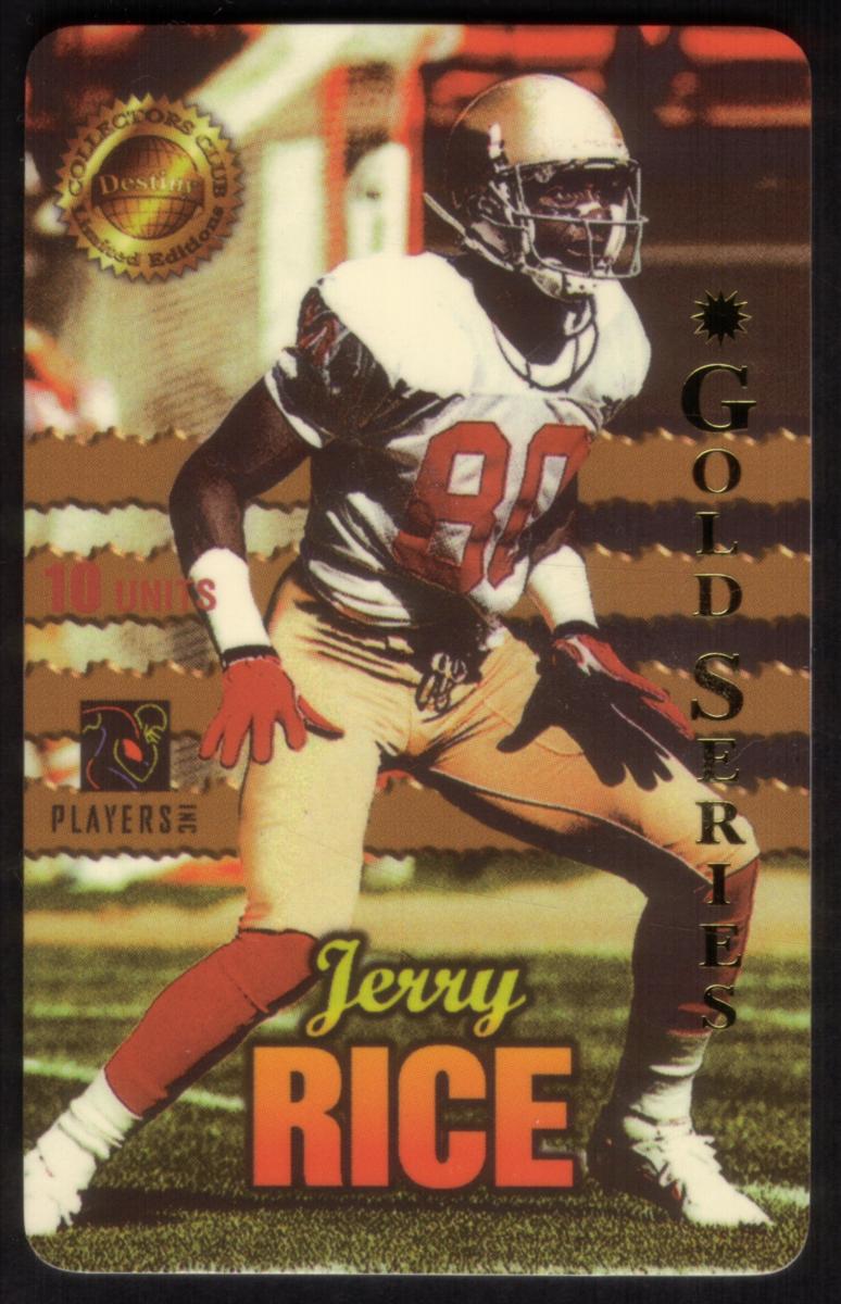 This card is a collectible sports chip card dedicated to one of the greatest NFL players in history, marked by its limited edition status and detailed player information. It visually connects fans and collectors to the sport of football, the NFL, and Jerry Rice’s legacy as a wide receiver for the San Francisco 49ers.