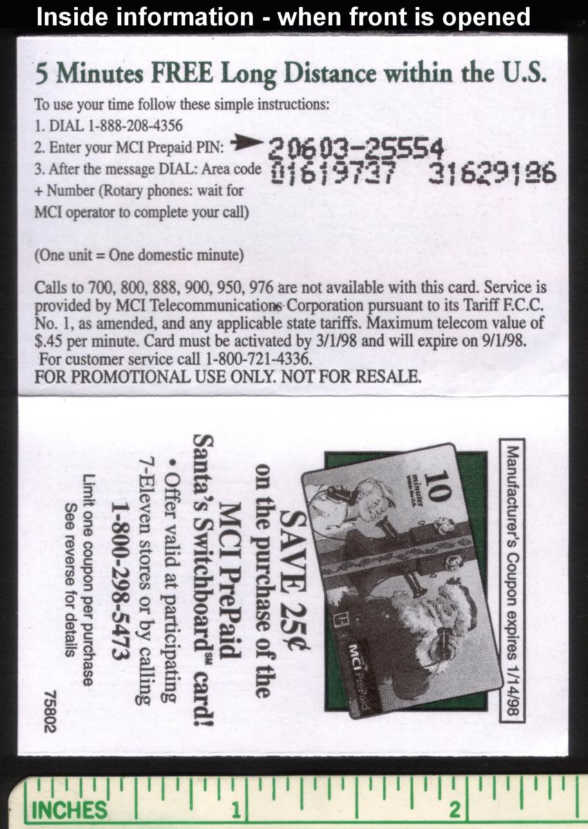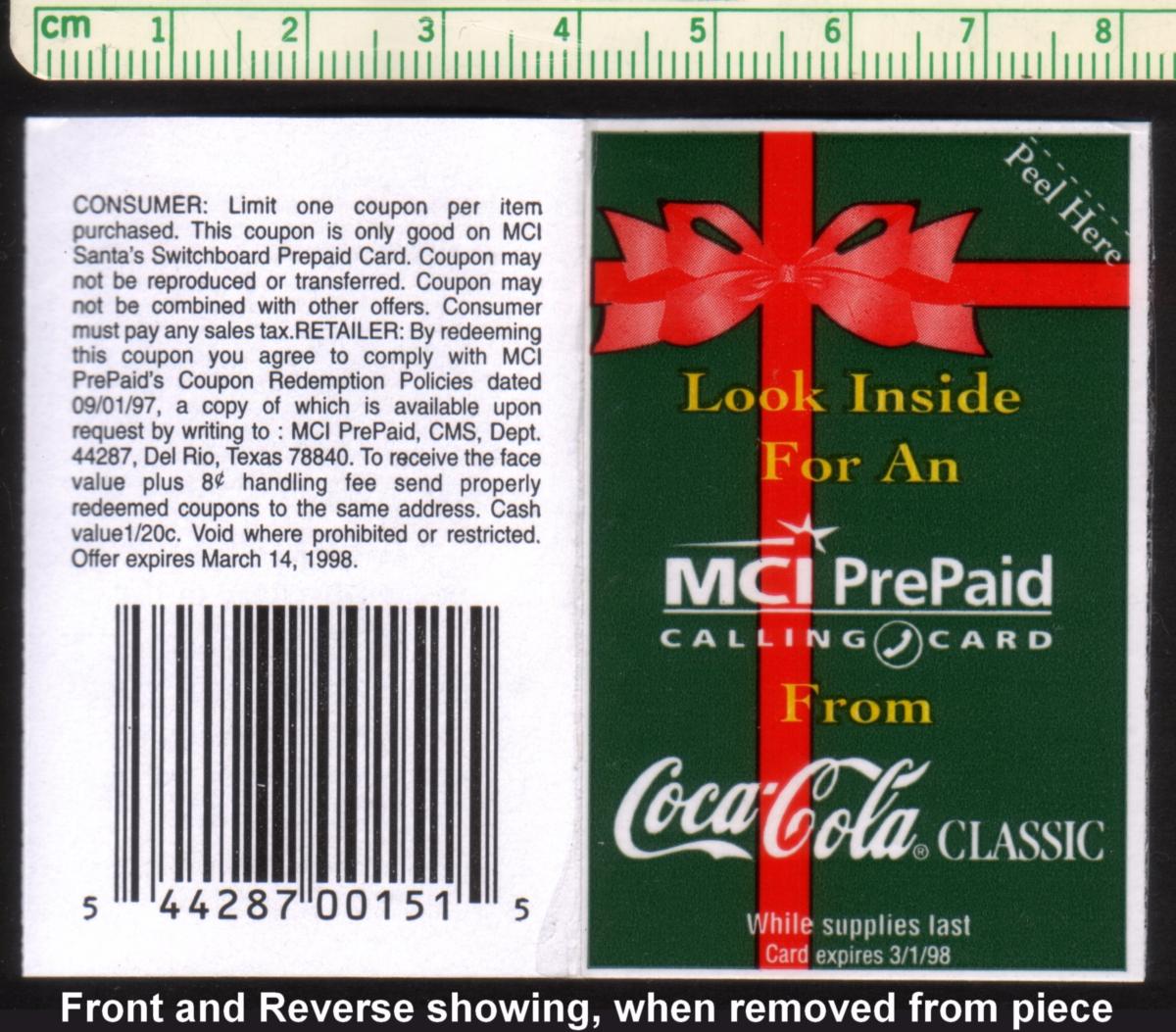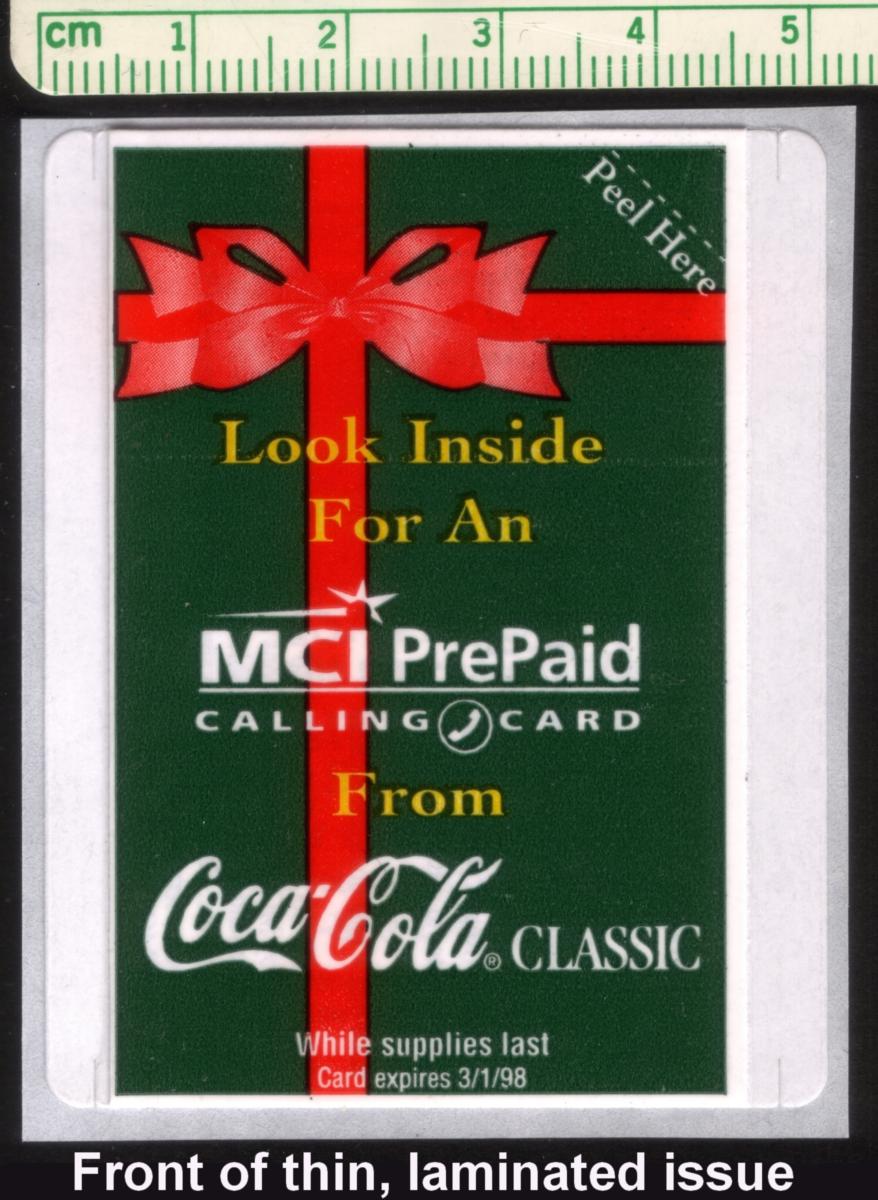 This small-size, laminated collectible card represents a holiday-themed promotion by MCI Telecommunications Corporation, combining the iconic Coca-Cola Classic brand with MCI's prepaid calling services from the late 1990s.