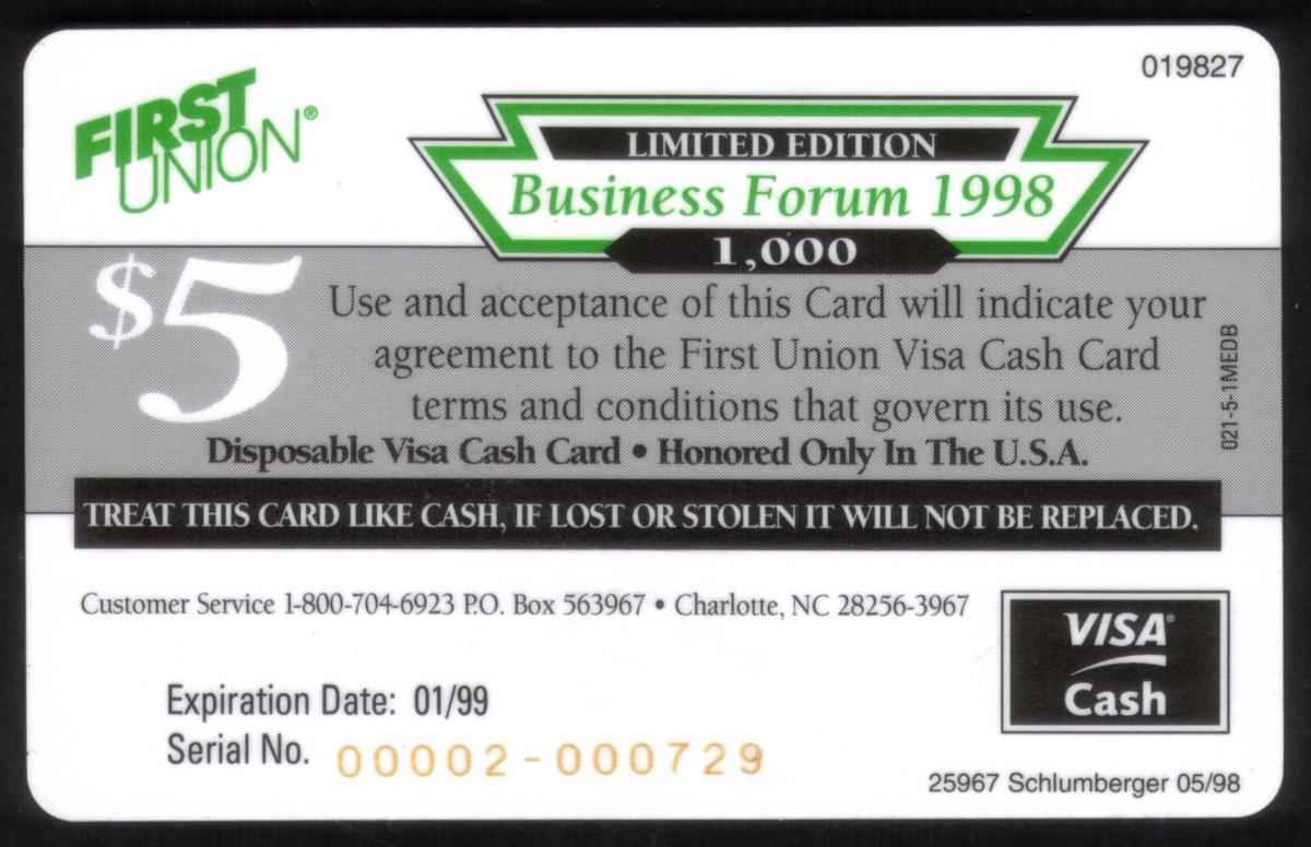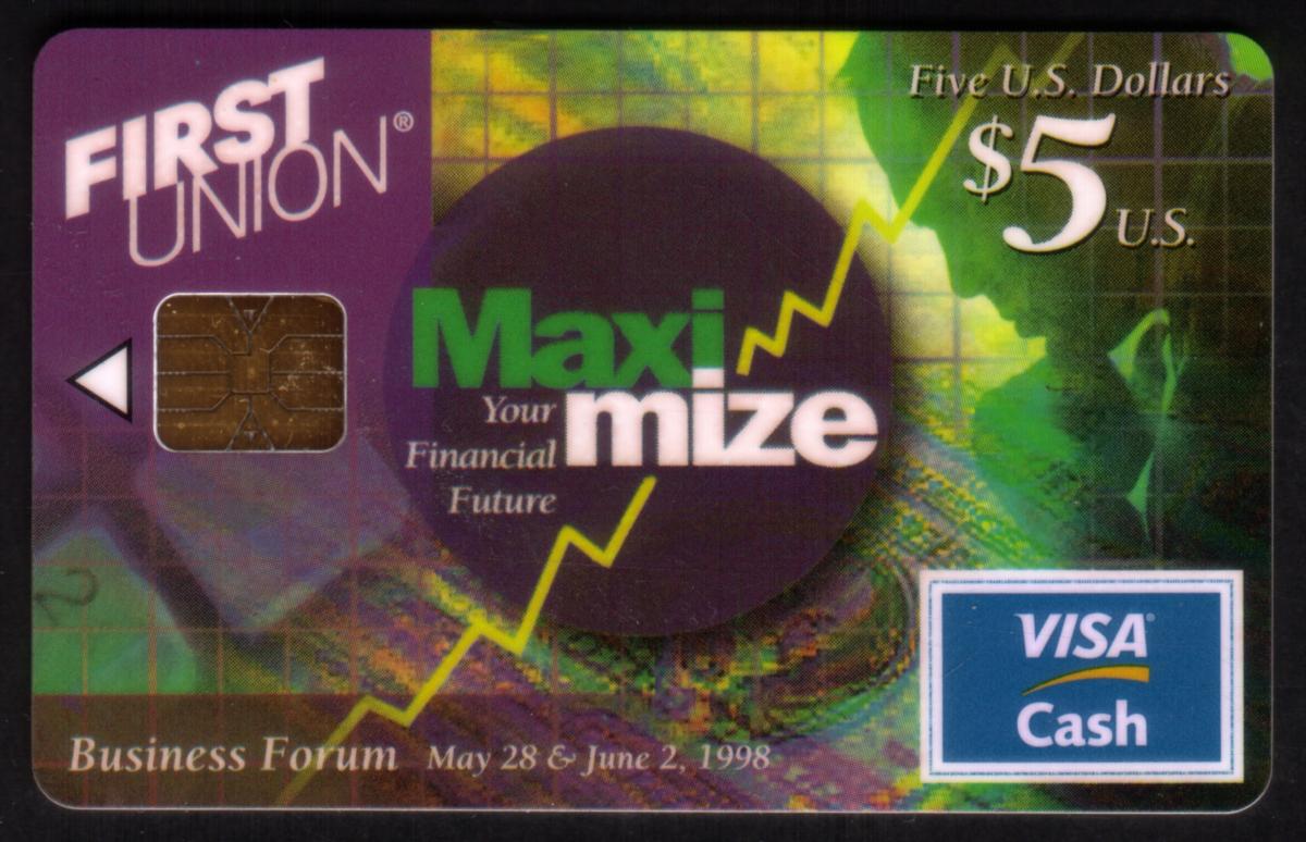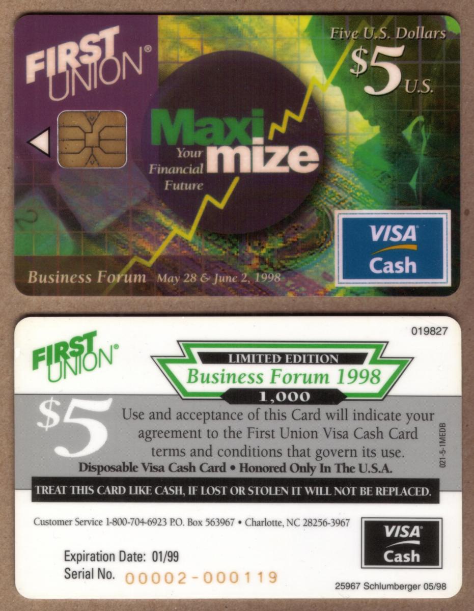 This promotional card is linked to Schlumberger’s maxi-mize $5 stored value chip card series and represents a financial product supported by First Union Corp. Bank for use during their 1998 Business Forum.