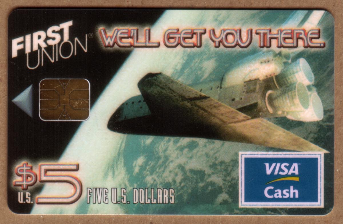 This is a First Union Visa Cash Card featuring a $5 stored value. The card’s main visual depicts the Space Shuttle orbiter in orbit above Earth, shown with the planet’s blue and white atmosphere visible beneath it. The shuttle is positioned prominently on the right side of the card with detailed textures on the spacecraft's surface, including the cargo bay and engines.