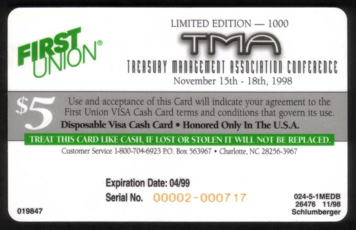 This card was issued in 1998 for the Treasury Management Association Conference and sponsored by Schlumberger and First Union Corp. Bank. It serves as both a promotional item and a smart stored value Visa Cash Card.