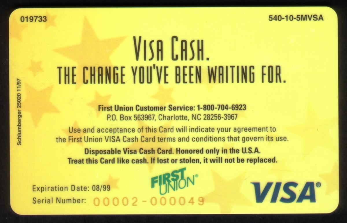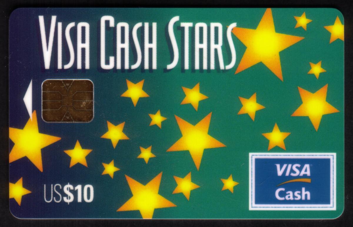 This promotional stored value smart card is issued by First Union Corp. Bank. The card’s bright and colorful design emphasizes the "stars" theme, matching its title and purpose as a $10 prepaid Visa Cash Stars card.