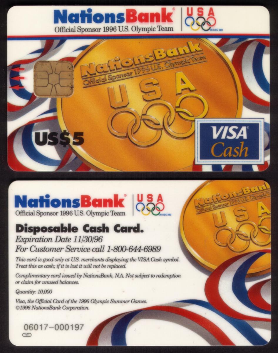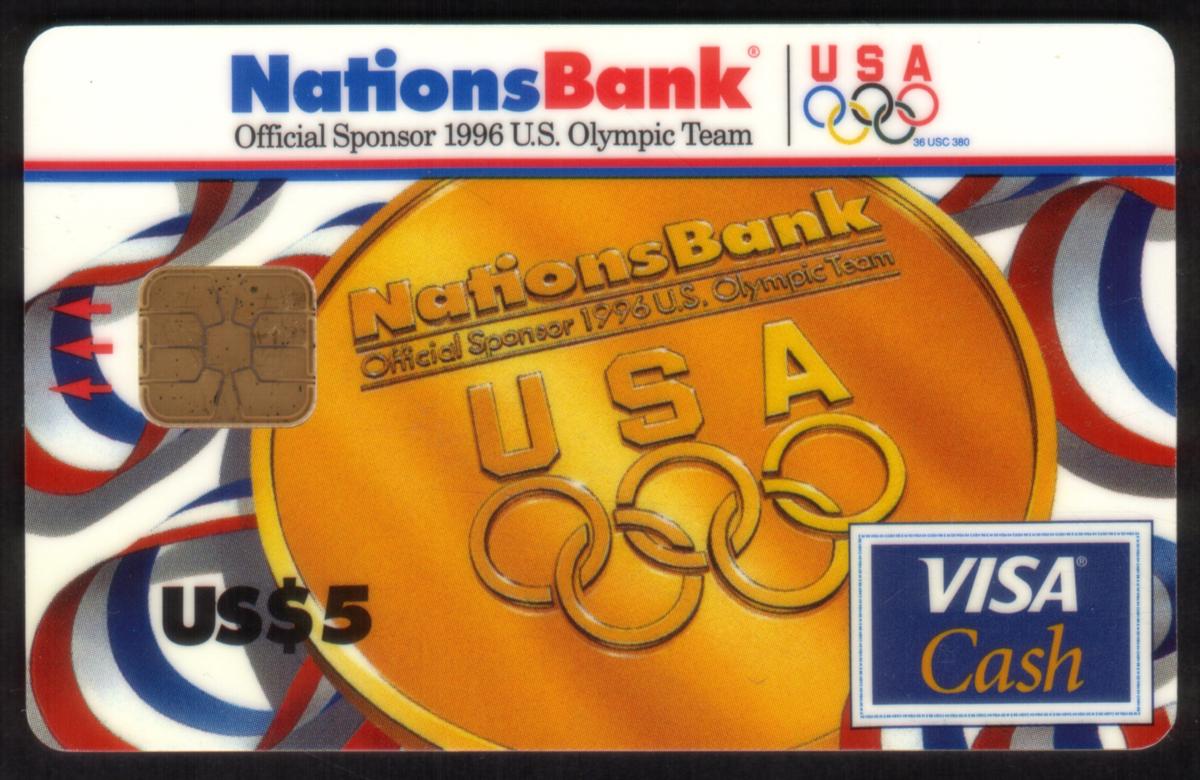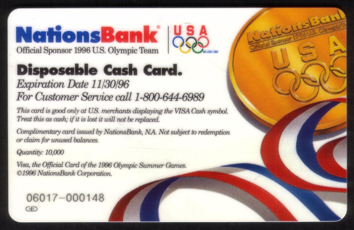 This collectible bank card celebrates the 1996 Summer Olympics and the official partnership between NationsBank and the U.S. Olympic Team, highlighting its role as a promotional item given to the media.