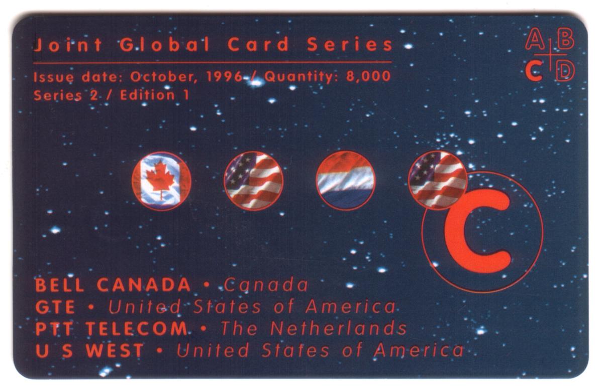This card is part of the GCA 1996 Global Chipcard Alliance collection, representing a collectible stored value smart card from GTE Communications. It combines patriotic imagery with telecommunications symbols to highlight its connection to worldwide communication networks.