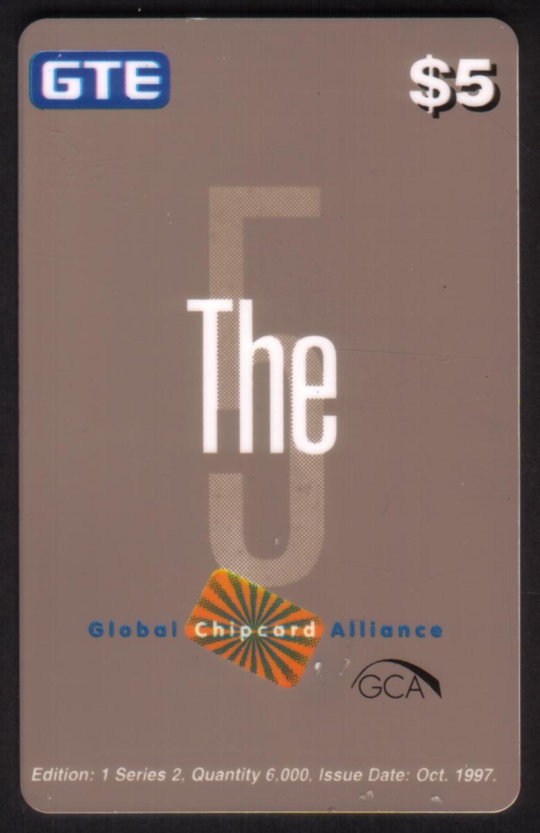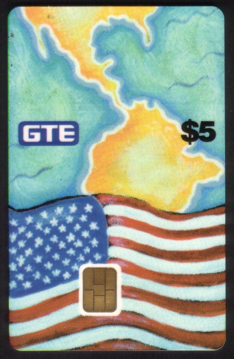The card has a stored value of $5, indicated in bold black print near the top right area. The integrated chip is located near the center, embedded within the flag's stripes, highlighting the card’s smart card technology typical of the period’s telecommunications or payment cards. The combination of the GTE branding and the American flag emphasizes a connection to U.S.-based communications services under the Global Chipcard Alliance initiative of 1997.