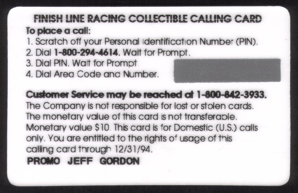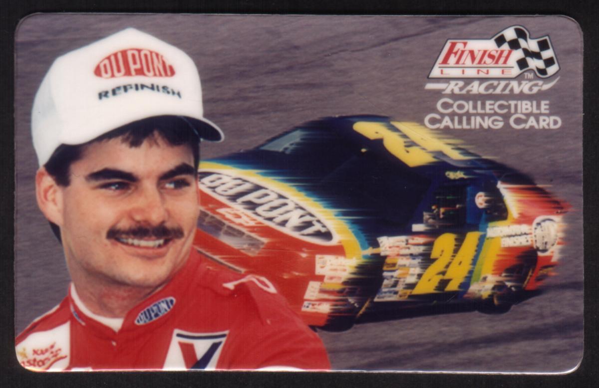 In the upper right corner, the card displays the Finish Line Racing logo alongside the text "COLLECTIBLE CALLING CARD," emphasizing the card’s theme. The overall design highlights Jeff Gordon and his DuPont-sponsored car, capturing key elements of his involvement in NASCAR racing.